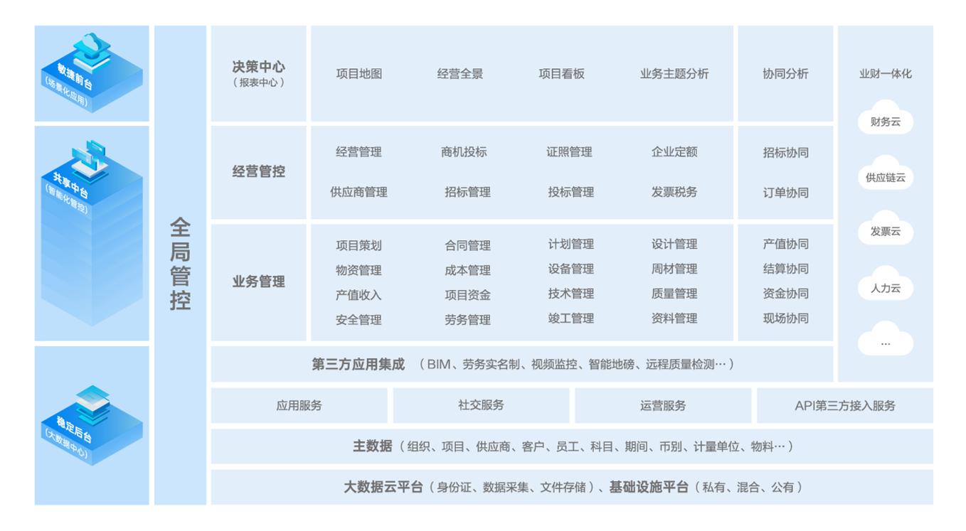 建筑企业数字化解决方案以项目管理、企业经营管理、供应链管理为理念支撑,提供项目从经营与投标、工程设计到竣工管理为一体的全生命周期解决方案,实现建筑企业人财税一体化管控,全面提升工程项目经营管控水平