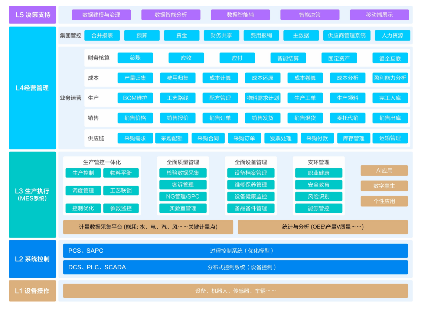 通过位于L4层级的ERP作为企业经营管理平台,聚焦于企业人财物产供销各类业务的执行与管控,以及业财一体化。位于L3层级的MES则关注日生产计划的执行、车间设备资源、执行过程的数字信息采集等,并为质量在生产环节的追溯提供数据。二者的对接主要为企业高阶生产计划与车间执行任务的对接,同时MES系统为ERP提供能耗、质检、设备管理等数据