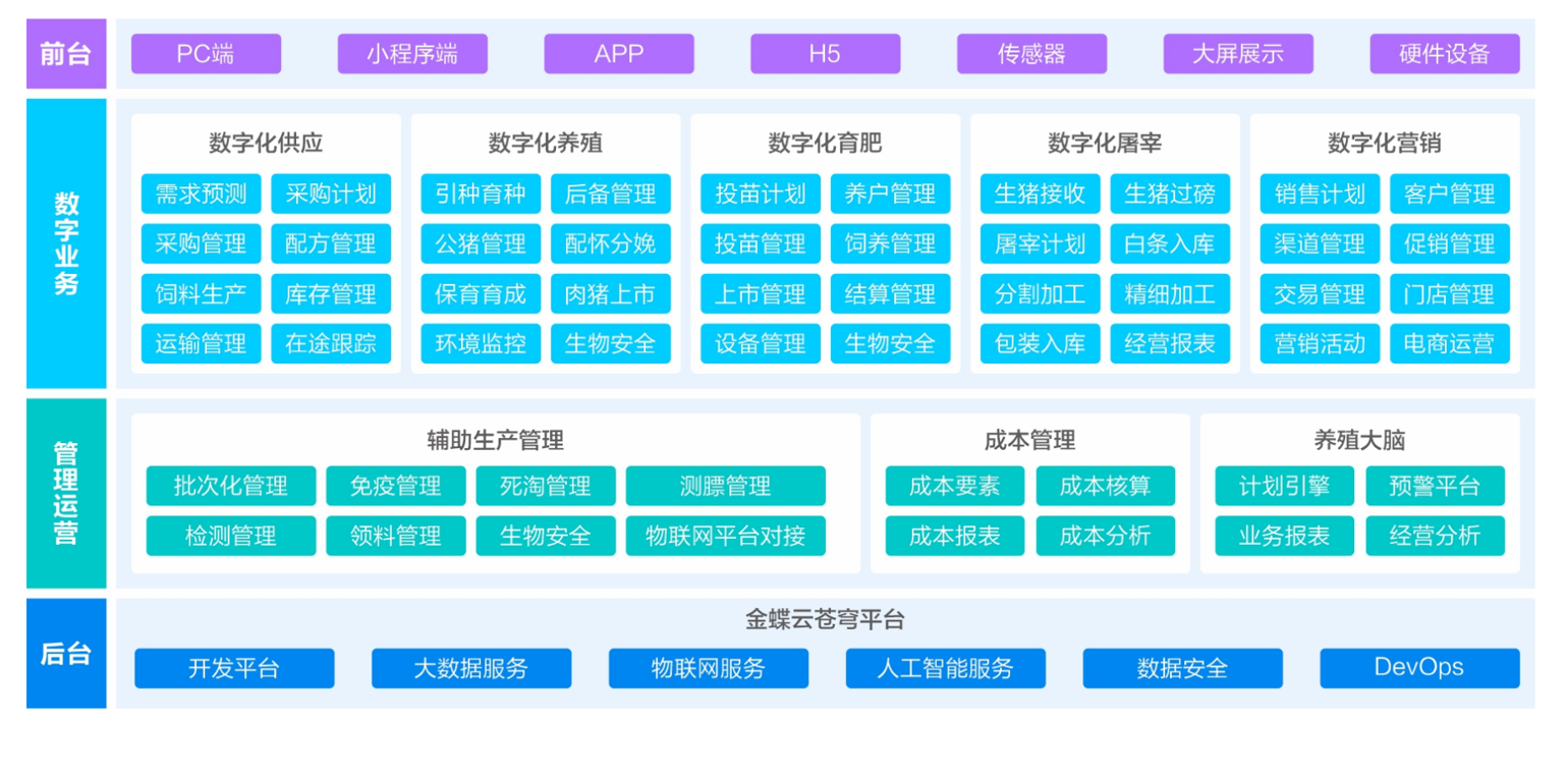 以金蝶云苍穹平台为技术底座,融合智慧养殖、智能物联、数字营销、养殖成本、智慧大脑、合同云、猪只竞价、数字乡村等行业应用场景,涵盖牧业、禽业、渔业、种植业构建全场景全流程的精细化管理,并打通农业产业生态链赋能中小农户,支撑现代农牧企业向数字化、智慧化发展