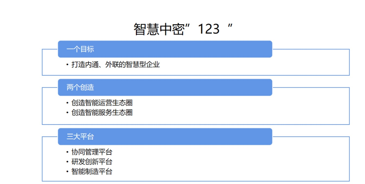 之前的旧系统已不能满足中密控股发展的需要,经过多轮反复的选型论证,中密控股在综合评估了国内外包括SAP、金蝶、用友、鼎捷等多款ERP系统的基础上,最终被强大的金蝶云平台打动,选定金蝶云星空,期望通过金蝶云星空的实施,建设中密控股“系统管理平台、研发创新平台、智能制造平台”三大平台为核心的一体化管理系统,共同打造智慧中密“123”,支撑中密控股未来5-10年的发展。