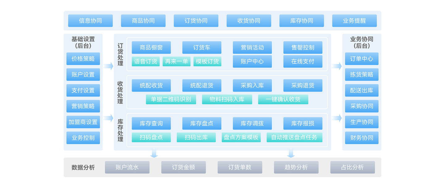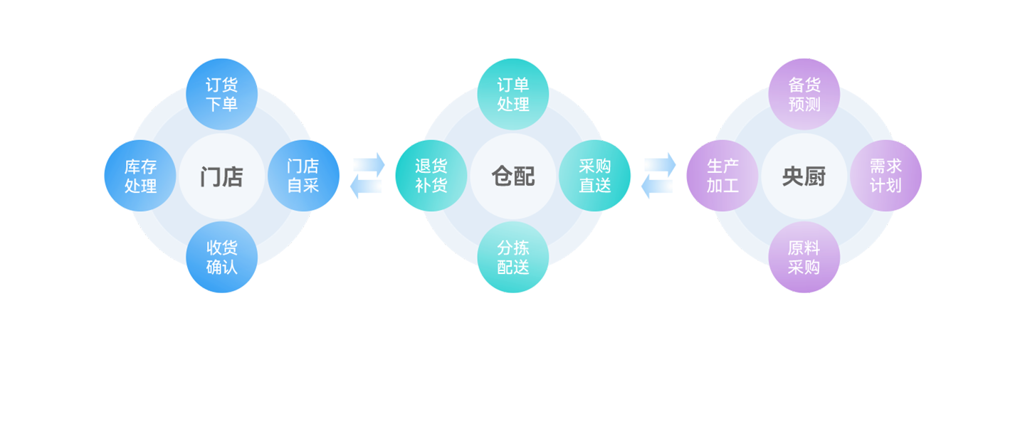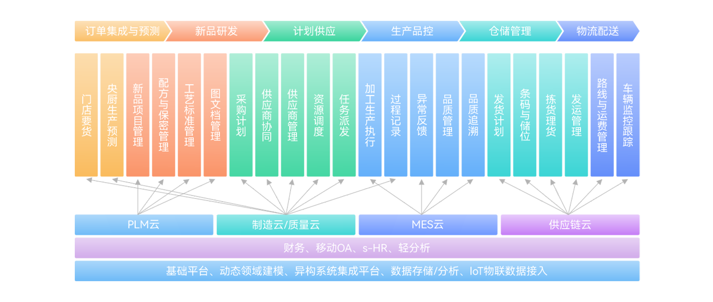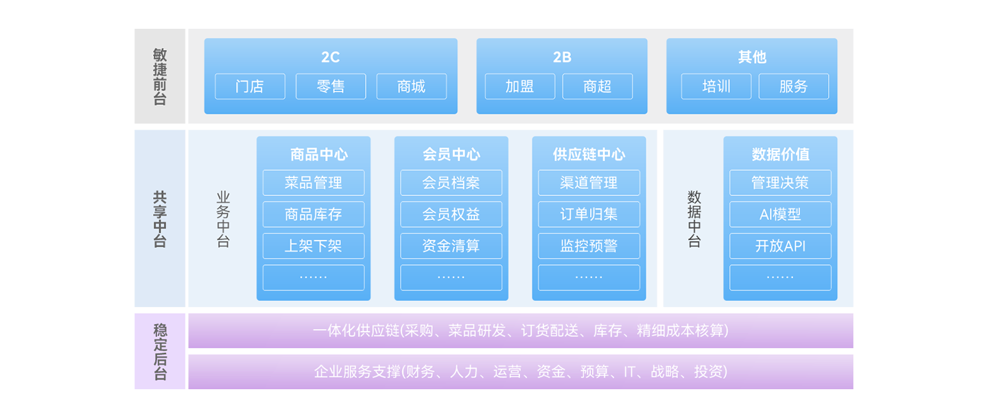 以集团为核心统一商品、物料、供应链等主数据,实现端到端的供应链、央厨、门店运营、财务业务的一体化;以集团管控平台为依托,业务流程集中管控,保障管理制度落地;通过决策分析平台实现智能分析、预警、调度